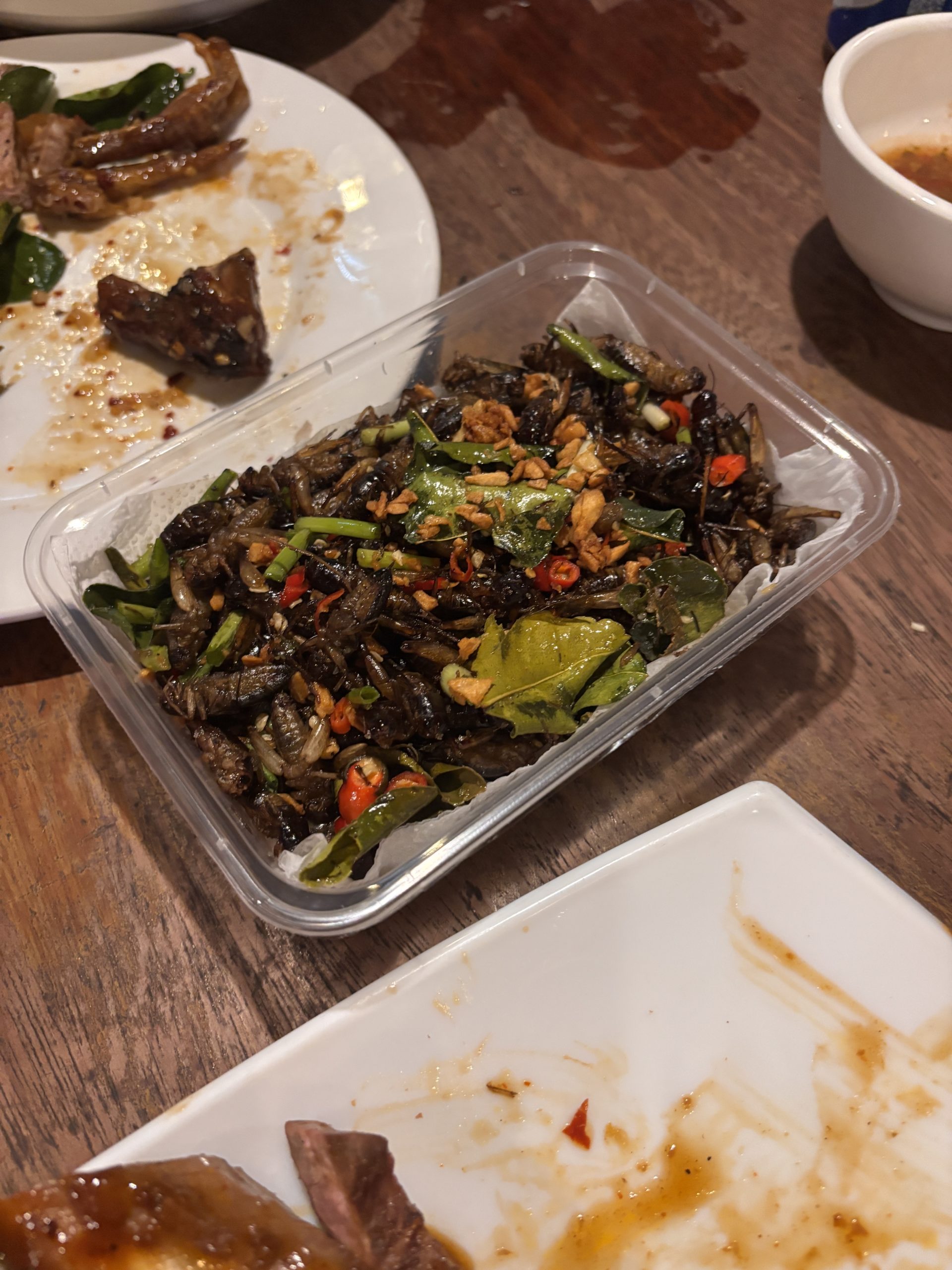 このユニークな料理に出会したのは、アンコールワットで有名な街シェムリアップを訪問中、ふと訪れたゲストハウス兼レストラン。最初は単なる客としてトムヤムクンとアンコールビールをキメていたのですが、そこの運営していた方とその家族がなんと日本に7年間住んでいたらしく、さらにそこには日本語を独学で学んでいるトゥクトゥクドライバーまでいたのです。そこで彼らと仲良くなり、次の日に再来店した際に彼ら家族とそのドライバーが会食をしていて「よかったら君も一緒に食べよう!」と誘ってくれたので、お言葉に甘えて混ぜてもらいました。その時に登場したのが、この昆虫料理。